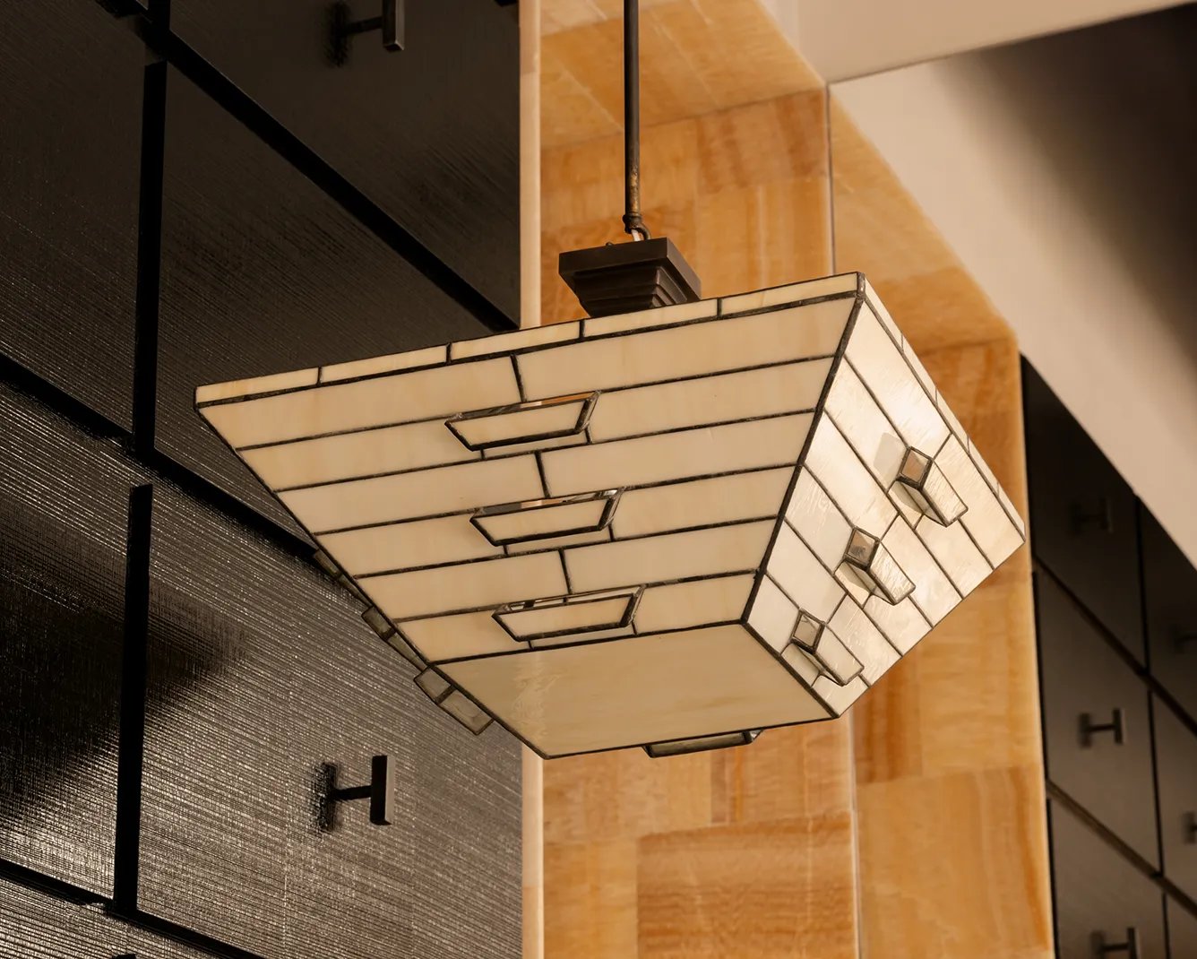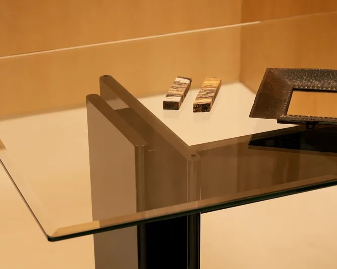 Centralnym punktem jest okrągły stół ekspozycyjny oświetlony ręcznie formowanym świetlikiem autorstwa Macieja Rafalskiego, którego struktura nawiązuje do surowego, nieoszlifowanego diamentu. Świetlik Rafalskiego to rzeźbiarska instalacja ze szkła artystycznego: każdy element został ręcznie formowany i barwiony, dzięki czemu jego powierzchnia rozprasza światło w sposób organiczny, budując atmosferę miękkiej, niemal biżuteryjnej poświaty. To największa realizacja artysty w komercyjnej przestrzeni premium, a zarazem obiekt, który nadaje wnętrzu wymiaru galerii sztuki użytkowej.